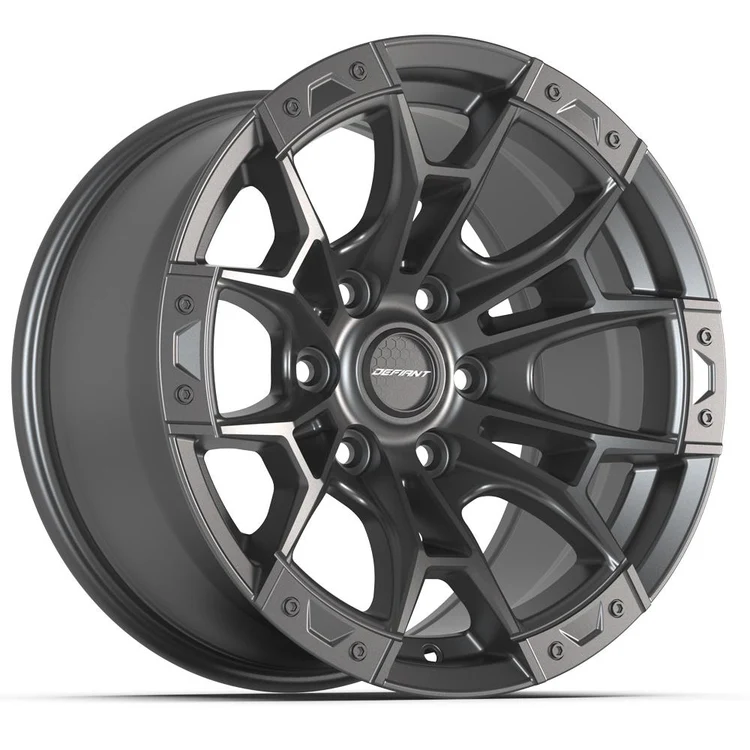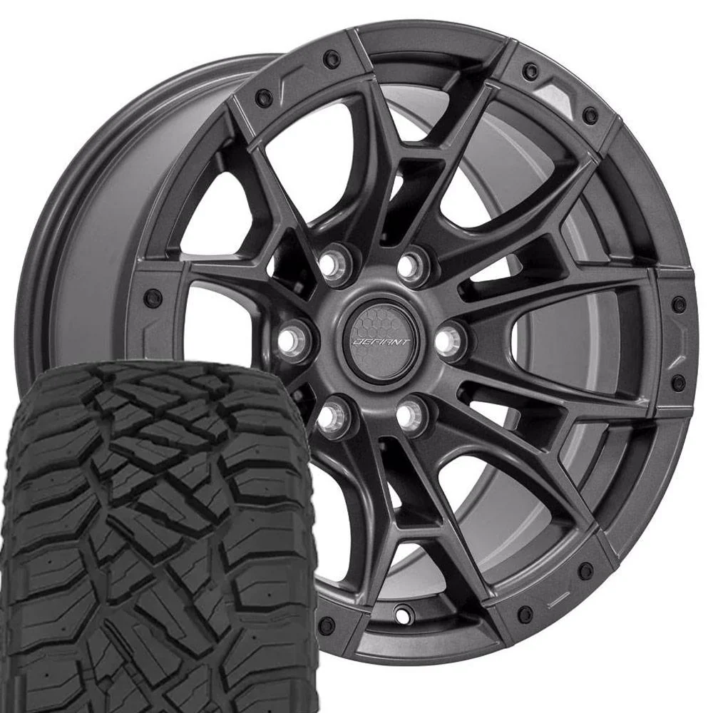 These DF04 Defiant wheels are 17×9 dark satin charcoal rims designed to fit the Ford F-150 and other compatible vehicles. Please check our fitment tab for specific year-make-model applications and will-not fit exceptions before ordering.