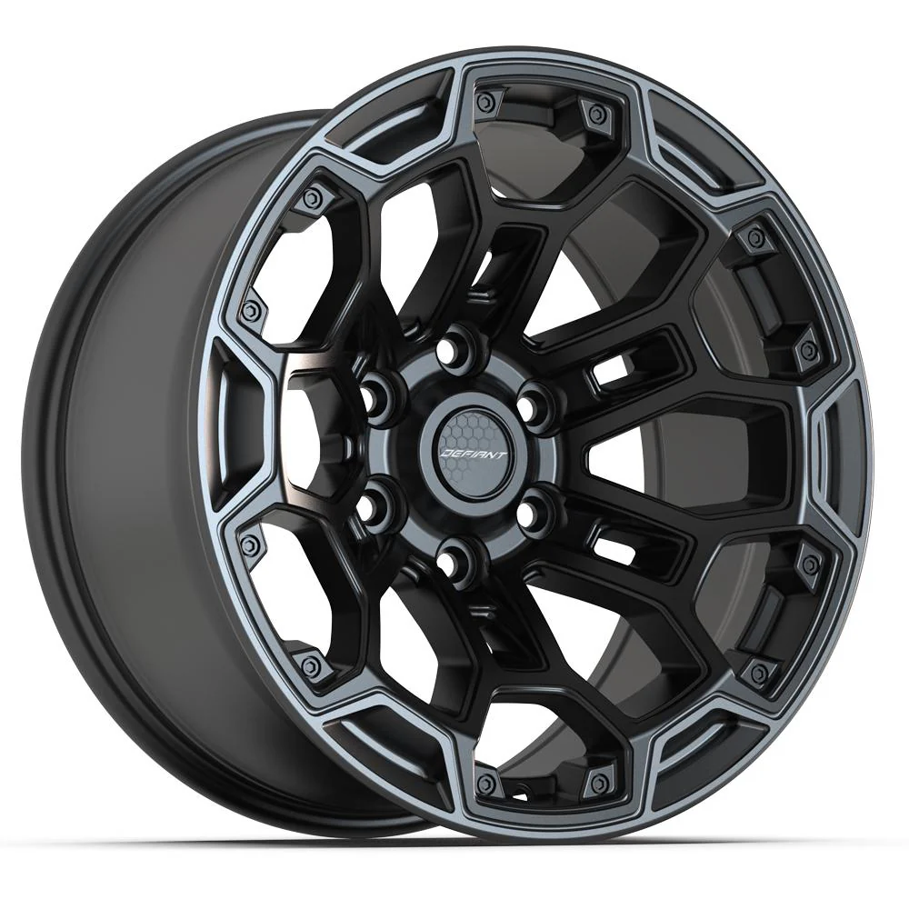 These DF03 Defiant wheels are 18×9 satin black with dark satin charcoal 2-tone rims designed to fit the Ram 1500 and other compatible vehicles. Please check our fitment tab for specific year-make-model applications and will-not-fit exceptions before ordering.