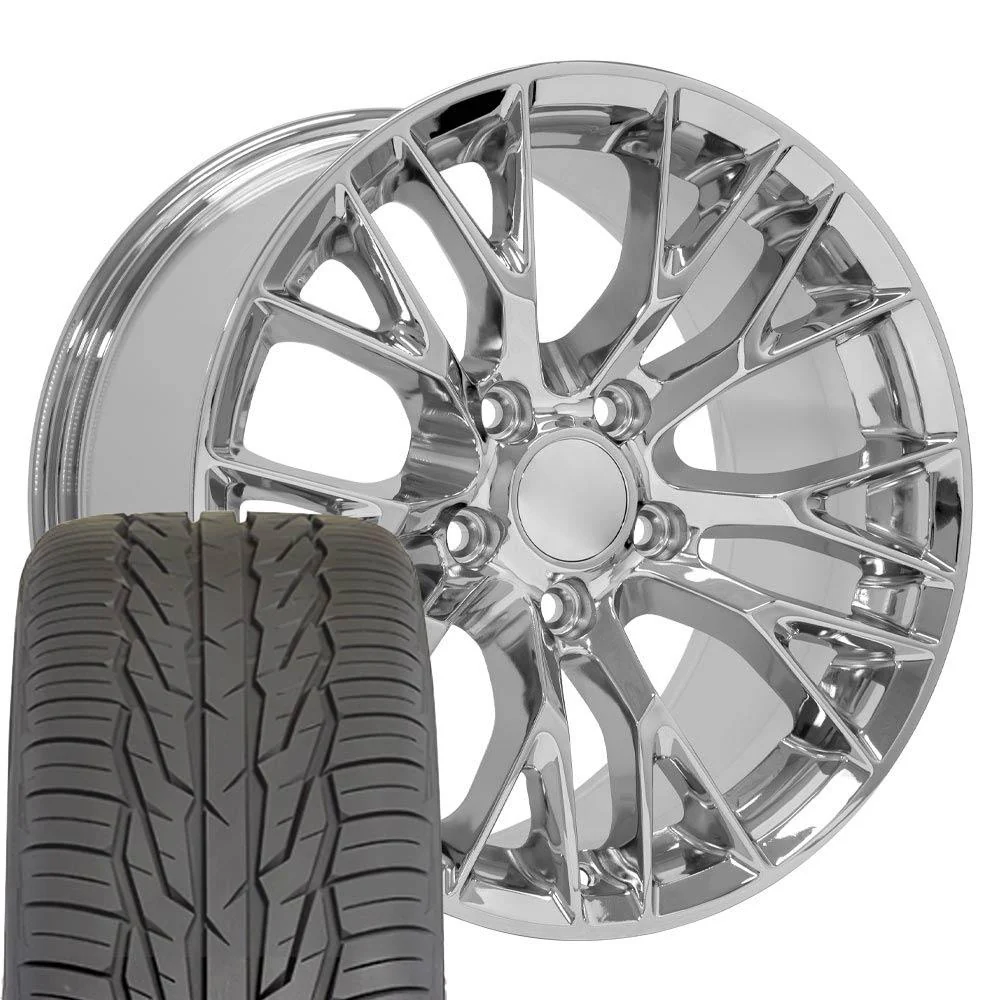 UPC 9509487 17 Inch Rims Fit Corvette Camaro C7 Z06 Style CV22 Chrome Wheels and Toyo Extensa Hollander 5734.This is a non-staggered set of four rims and four tires will arrive to you mounted and balanced. The Toyo Extensa HP II 275/45-17 is a High Performance All Season Tire designed as a value driven option providing a perfect balance between outstanding performance, quality and styling. The unidirectional tread design provides a perfect blend of all season traction. Full depth wave sipes provide a smooth and quiet ride, minimizes irregular wear and improves snow traction. Single cut and double cut tapers optimize block stiffness enhancing braking performance. Finally, the silica coumpound provides a better wet perfomance while maintaining the tread life performance of your new Toyo Extensa HP II Tires. 17×9.5 Rims Fit C4 Corvette and F Body Camaro C7 Z06 Style CV22 . These are Triple Plated Chrome Replica Wheels Hollander Number 5734