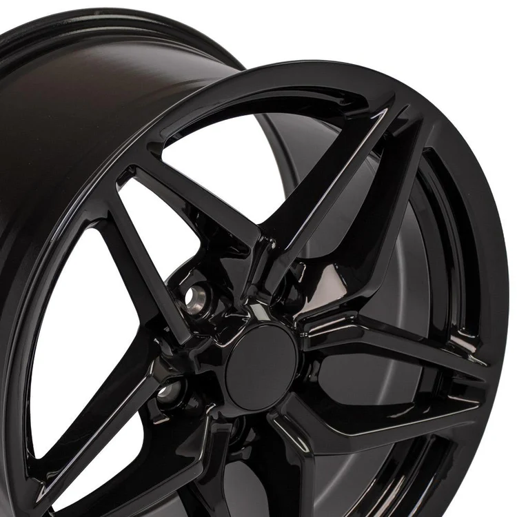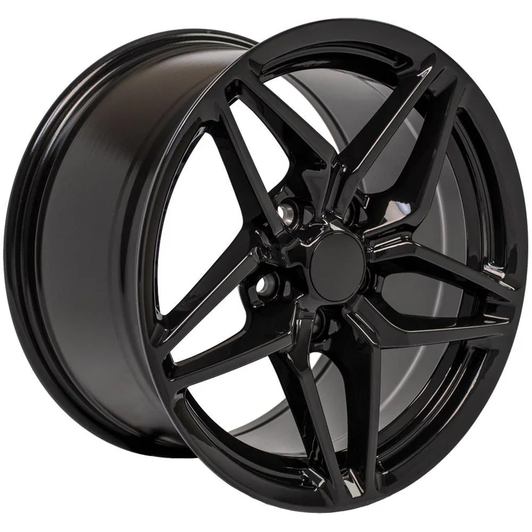 17 Inch Rims Fit Corvette – C7 ZR1 Style CV31 Black Wheels and Toyo Extensa Hollander 5928.This is a non-staggered set of four rims and four tires will arrive to you mounted and balanced. The Toyo Extensa HP II 275/45-17 is a High Performance All Season Tire designed as a value driven option providing a perfect balance between outstanding performance, quality and styling. The unidirectional tread design provides a perfect blend of all season traction. Full depth wave sipes provide a smooth and quiet ride, minimizes irregular wear and improves snow traction. Single cut and double cut tapers optimize block stiffness enhancing braking performance. Finally, the silica coumpound provides a better wet perfomance while maintaining the tread life performance of your new Toyo Extensa HP II Tires. 17×9.5 Rims Fit C4 Corvette and F Body – C7 ZR1 Style CV31 . These are Triple Plated Black Replica Wheels Hollander Number 5035